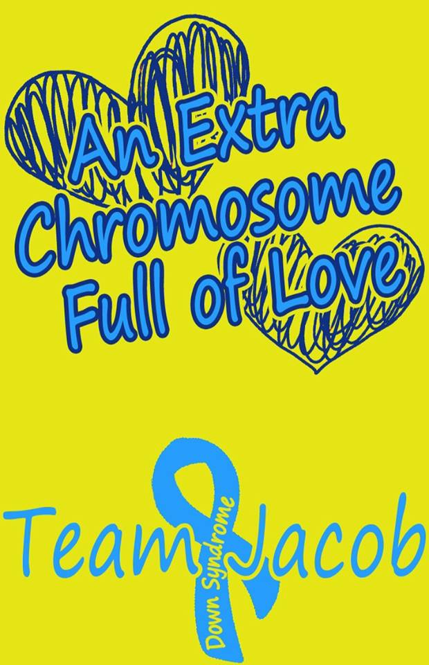 I guess the phrase an Extra Chromosome Full of Love just stuck.  As a total surprise my sister in law and her family designed Team Jacob shirts in honor of World Down syndrome Day (March 21).  The shirts are perfect and little did we all know they would be presented at the most perfect time.  They had been working on the project for some time prior to World Down Syndrome Day.  On March 19, 2014 Jacob went in for unexpected / urgent heart surgery.  2 days after his surgery they shared the shirts with us.  Bruce and I were in the PICU with Jacob as he was recovering.  Their thoughtful project brought us both to tears; we were emotional drained and still scared out of our mind, the shirts gave us the boost to keep fighting / advocating for Jacob.  We are so thankful to the Kortenkamp family — we LOVE the shirts!!!  I wear mine with pride and remember how strong Jacob was recovering when he had been so sick.